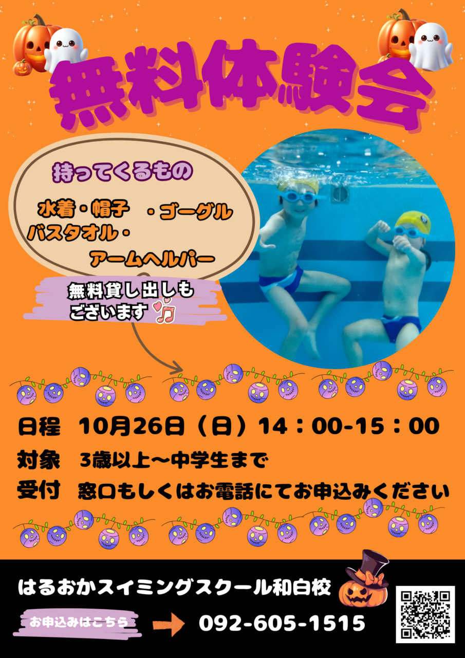 2025.10.5 【和白校】10/26(日)無料体験会 10/26(日)に3歳~中学3年生までを対象とした無料体験会を開講いたします。 ご予約はスクール窓口、もしくはお電話にて承っておりますので、お気軽にご連絡ください。 スポーツの秋!! お子さまの運動に水泳はいかがですか。 皆さまからのご応募、心よりお待ちしております♪ はるおかスイミングスクール和白校 TEL:092-605-1515 カテゴリ:お知らせ