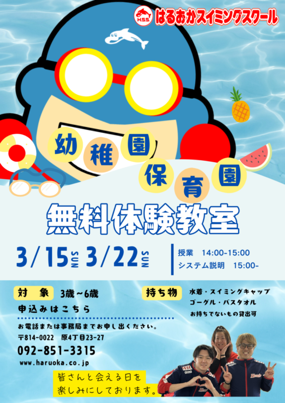 【持ち物】 水着・スイミングキャップ・ゴーグル・バスタオル