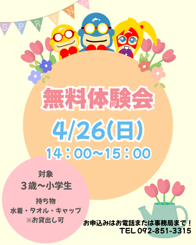 2026.3.26 体験会のお知らせ こんにちは! はるおかスイミングスクール原校です。 4月26日(日)に無料体験会を行います✨ 習い事でスイミングを検討中の皆様、まずは体験からいかがですか?? 体験会のご予約はお電話にて承っております。 TEL 092-851-3315 皆様のお申込みお待ちしております😊✨ カテゴリ:お知らせ