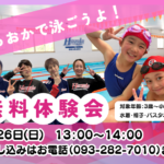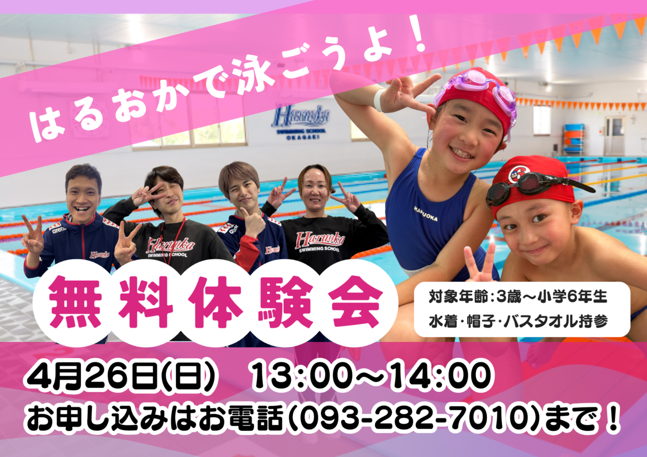 2026.3.10 【4月26日(日)】無料体験会のお知らせ はるおかスイミングスクール岡垣校です♪ 4月26日(日)に無料体験会を行います💛 お申し込みはお電話(093-282-7010)にて承っております☺ みなさまのご来校をお待ちしております✨ カテゴリ:お知らせ